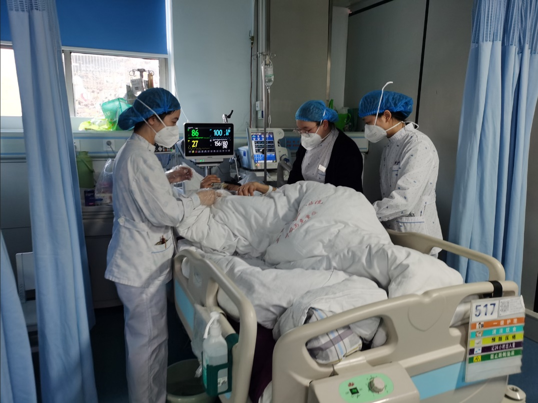 在重症一区和二区,病房里到处是医护人员忙碌的身影,患者突发情况多,护理难度大,医生要随时关注患者病情,护士发现情况也会及时反馈给医生。