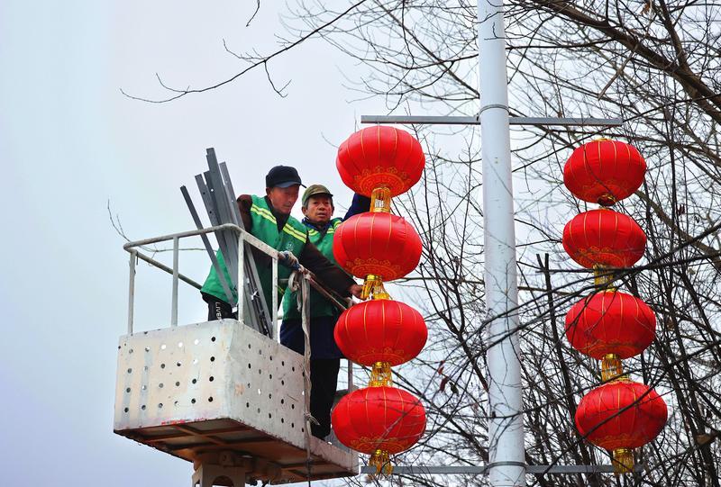 1月12日,随州城区迎宾大道,市园林服务中心园林工人正在悬挂灯笼,喜迎新春佳节。 (随州日报全媒记者 李文军摄)