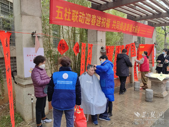 除了喜庆的春联,便民服务摊位也格外热闹。在现场志愿者及社工的引导下,社区老年协会志愿者现场为长者免费理发,为辖区老年居民感受到了社区的关心和爱护。