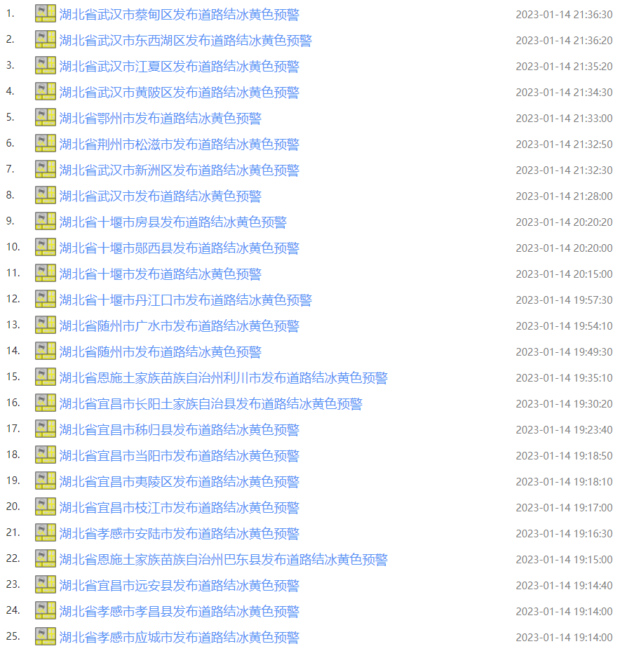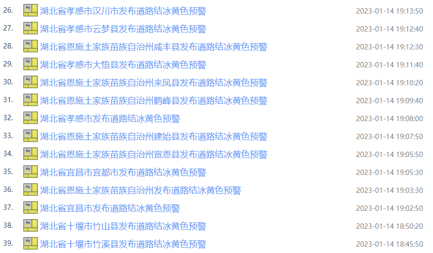 截至21时36分,湖北已发布39条道路结冰黄色预警。武汉市、鄂州市、随州市、十堰市、恩施州、宜昌市、荆州市、孝感市等地,预计今晚到明天,将出现对交通有影响的道路结冰,请注意防范。