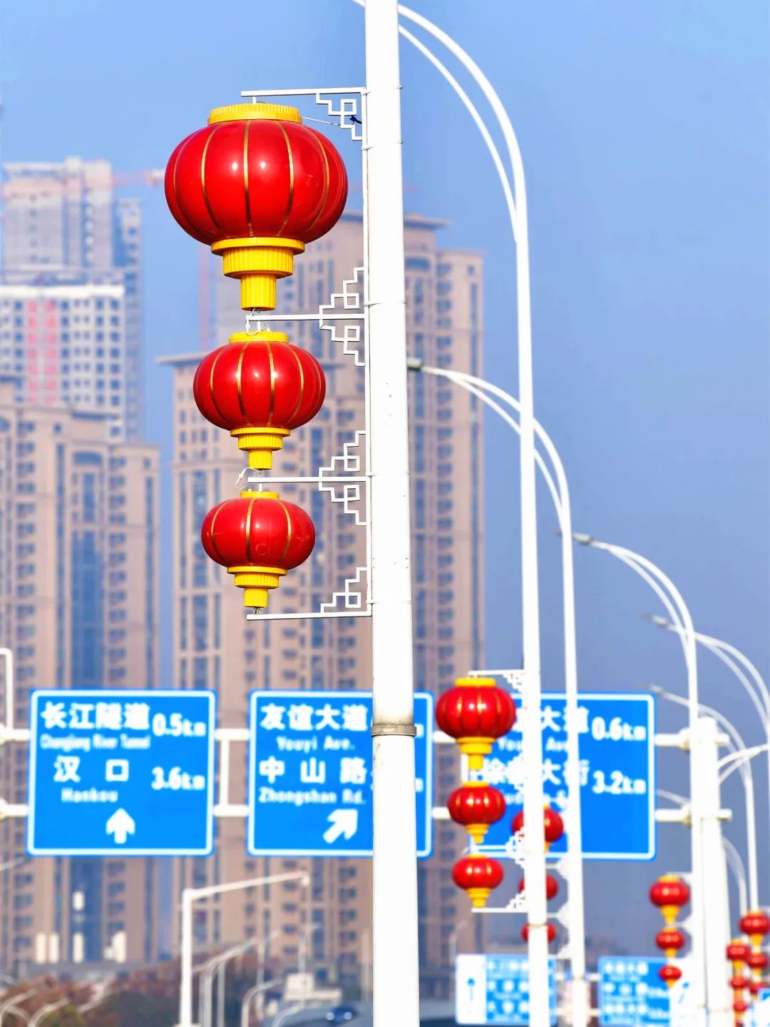两旁的路灯杆上分别悬挂了