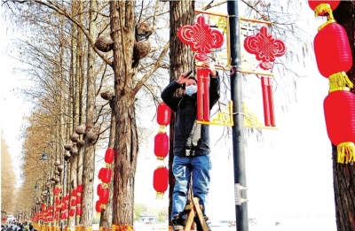 东湖绿道上工程师傅在挂中国结和灯笼。