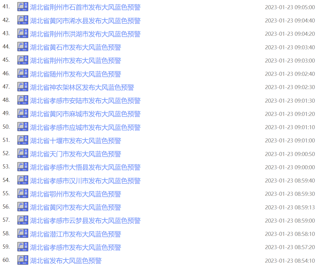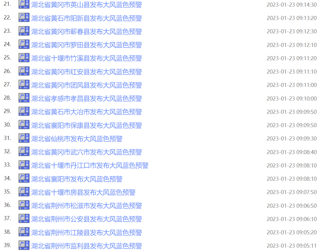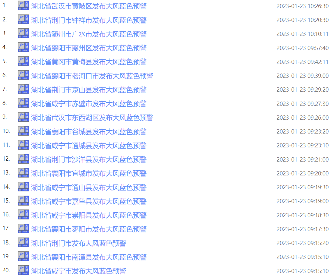 武汉中心气象台2023年01月23日08时49分发布大风蓝色预警信号:预计今天午后到明天上午,除恩施地区外,全省大部自北向南有3到4级偏北风,阵风5到7级,局部可达8级,请注意防范!