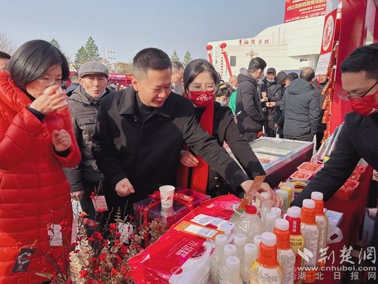 荆楚网(湖北日报网)讯(通讯员 石勋 万黎)1月24日,“黄冈东坡文化庙会2023年春节季分会场——黄梅正月唱大戏”活动在黄冈市黄梅县文化公园正式开幕。锣鼓声声震天响,戏曲悠扬贺新春。活动现场,各种地标优品、迎春表演、促销活动,吸引了不少市民前来观看购买。
