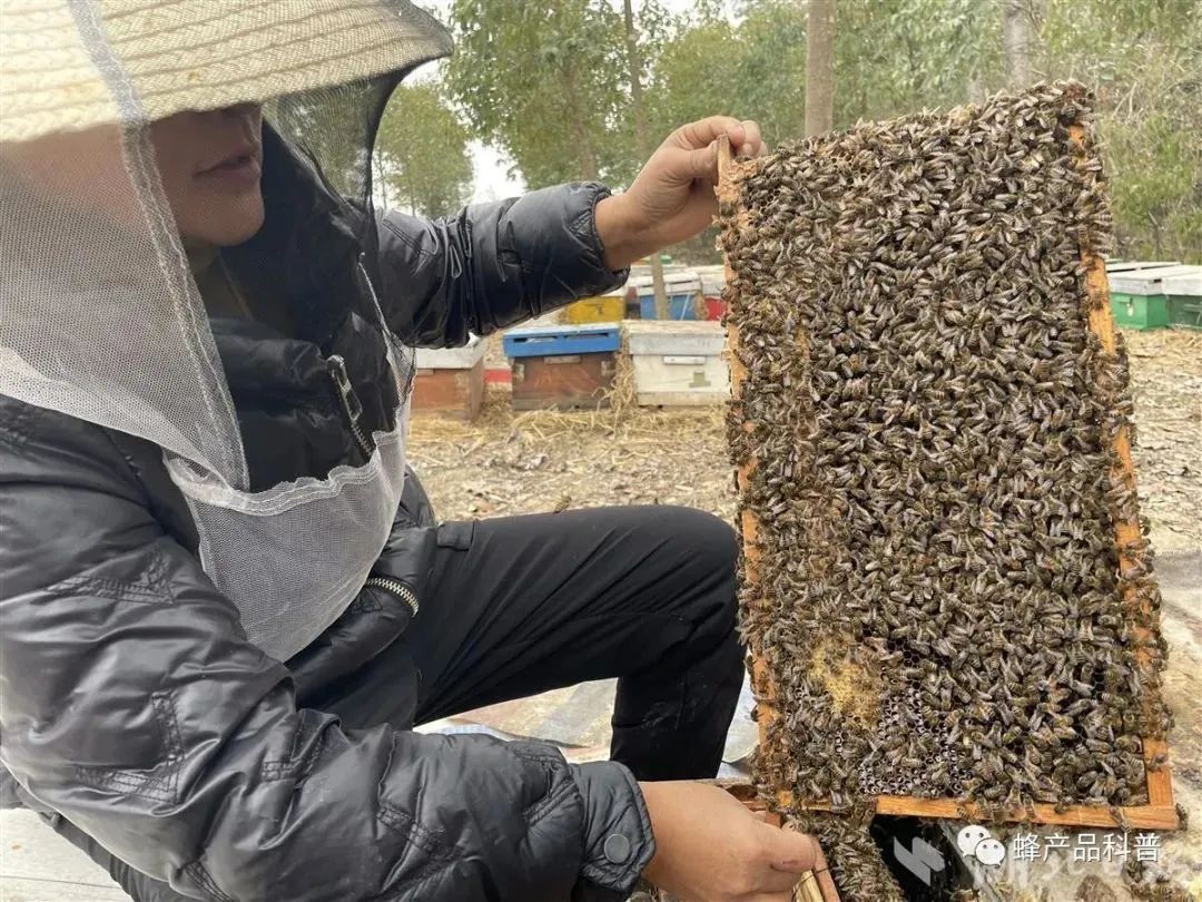 刘晓梅今年50岁,是荆明养蜂专业合作社负责人,24岁开始学养蜂,已有26年“蜂龄”。她动作娴熟地打开一个蜂箱,抽出一扇巢框,用手指轻轻在蜂群里拨弄,检查两框后,顺利找到这箱蜂的蜂王。“每个蜂箱里有一只负责繁殖后代的蜂王。这一箱蜜蜂现在约5000只,等油菜花开时,能繁殖到2万只。”