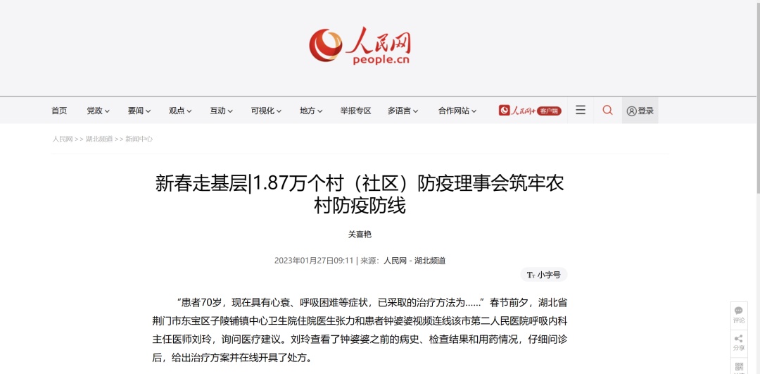 “患者70岁,现在具有心衰、呼吸困难等症状,已采取的治疗方法为……”春节前夕,湖北省荆门市东宝区子陵铺镇中心卫生院住院医生张力和患者钟婆婆视频连线该市第二人民医院呼吸内科主任医师刘玲,询问医疗建议。刘玲查看了钟婆婆之前的病史、检查结果和用药情况,仔细问诊后,给出治疗方案并在线开具了处方。