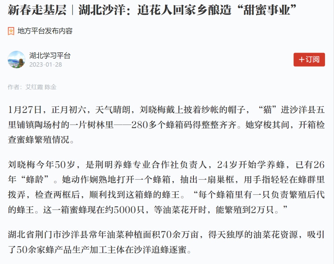 “在家过年的感觉真好!踏实又舒心!”刘晓梅说,今年起她就不再随丈夫一起外出放蜂,安心在老家酿造“甜蜜事业”。