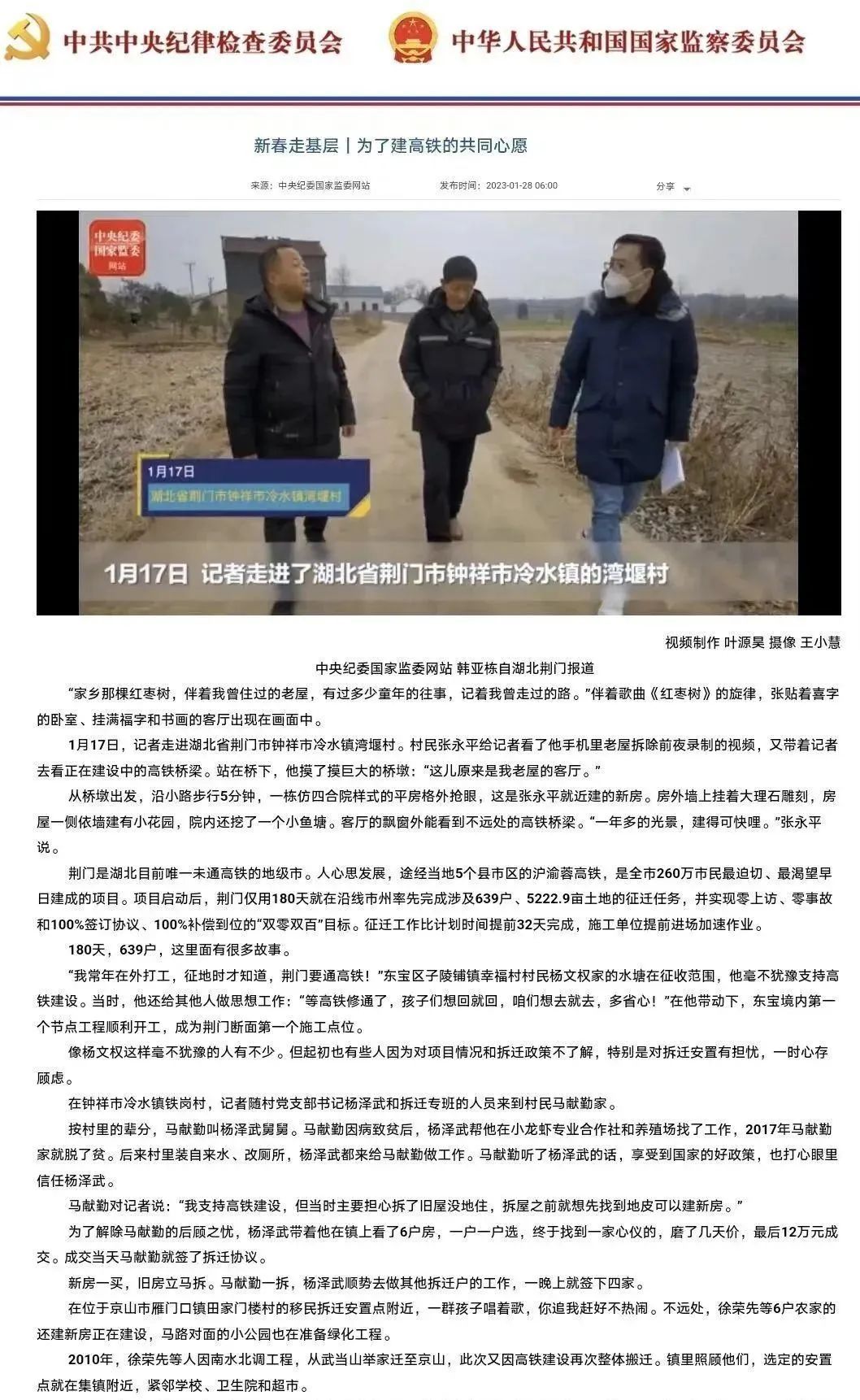 “新房子就医、就学、生活都方便,离我的庄稼地也不远。”徐荣先提起新家满心欢喜。目前,安置房的水、电、通讯、垃圾处理等已全部完工,今年5月就可入住。拆迁前,政府给他们发放了半年租房费,可就近租房,村里帮着搬家。“拆迁安置,群众心里有‘三怕’,一怕拆迁后住的地方没保证,二怕往后生产生活不方便,三怕搬迁有困难时没人管。帮着把问题都解决了,怎能不让人服。”徐荣先说。在采访中,记者还了解到,为推动高铁征地拆迁顺利推进,荆门市纪委监委开展市、县、乡、村“四级联动”督导,加强日常监督、专项检查,在保证拆迁工作规范有序推进同时保障征迁群众切身利益,实现工程建设和群众满意双赢。荆门市委常委,市纪委书记、监委主任刘亚锋给记者讲了一件事。在一次联合检查中,工作人员发现东宝区子陵铺镇几位拆迁专班干部把握政策出现了偏差,但干部们的本意是为了照顾情况极为特殊的3户家庭,并不存在优亲厚友等问题。联合检查组经研究,最后建议对有关干部免予处理。专班干部得到信任,没有“背上包袱”,认真做好后续工作,更加精准执行政策。群众体会到干部工作的不容易,也知晓了纪委监委的监督细致有力,而且“一是一二是二,分得很清楚。”“感动在先,拆迁在后”“小细节换来大理解”,荆门市高铁拆迁工作得以顺利完成。干部群众在拆迁中,将心比心,以心换心。大家都说,这是铁关系、真感情。