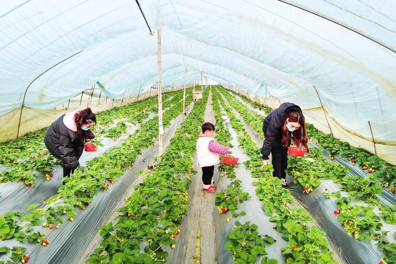 1月29日(正月初八),随县均川镇红石垭村采摘园里的大棚草莓迎来盛果期,不少市民呼朋唤友、携家带口穿梭在草莓园,悠闲采摘成熟的草莓,尽享“莓”好时光。 (随州日报全媒记者李文军、通讯员汪文平摄)