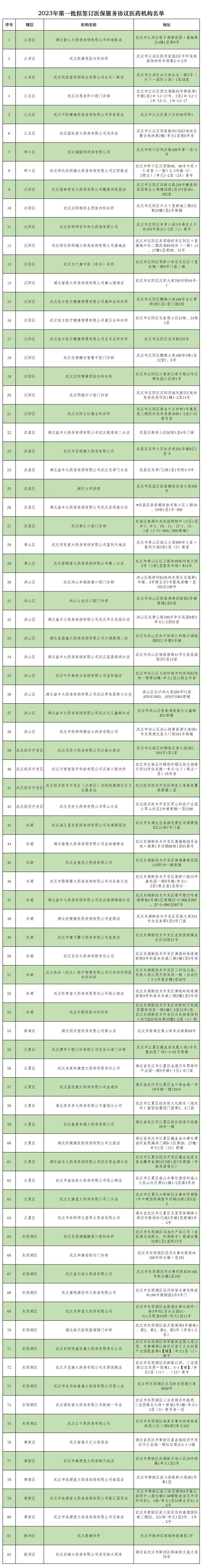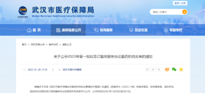 1月28日,武汉市医疗保障局官网发布《关于公示2023年第一批拟签订医保服务协议医药机构名单的通知》,根据通知,官网将评估合格拟签订医保服务协议的医药机构名单予以公示,共有82家门诊、药店拟纳入医保,公示时间为2023年1月28日至2月1日。
