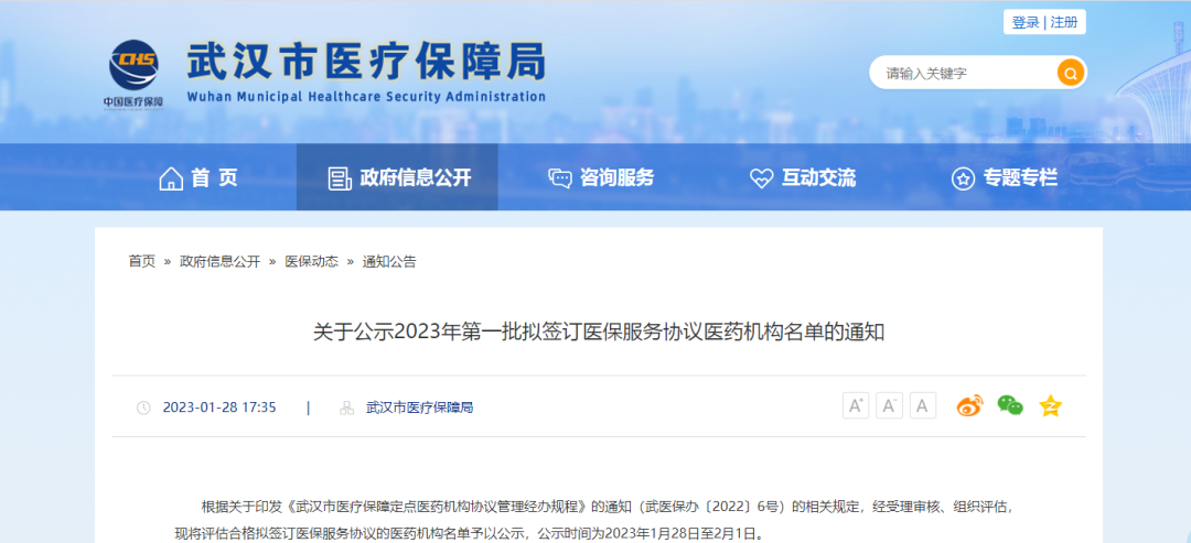1月28日,武汉市医疗保障局官网发布《关于公示2023年第一批拟签订医保服务协议医药机构名单的通知》,根据通知,官网将评估合格拟签订医保服务协议的医药机构名单予以公示,共有82家门诊、药店拟纳入医保,公示时间为2023年1月28日至2月1日。