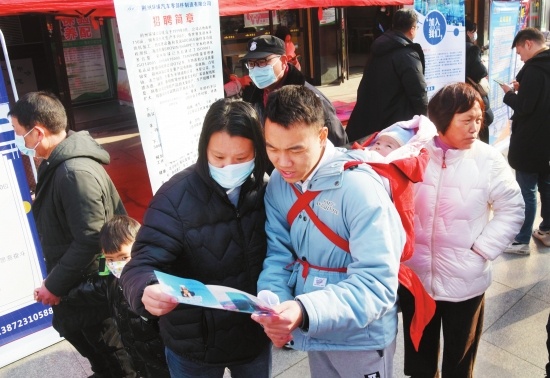 1月30日,在2023年沙市区“春风行动”招聘会现场,一对夫妻求职者带着襁褓中的宝宝在各招聘展位上来往穿梭,寻找合适岗位。