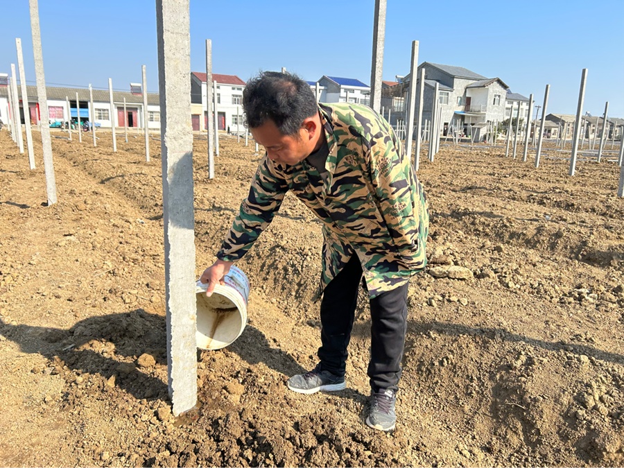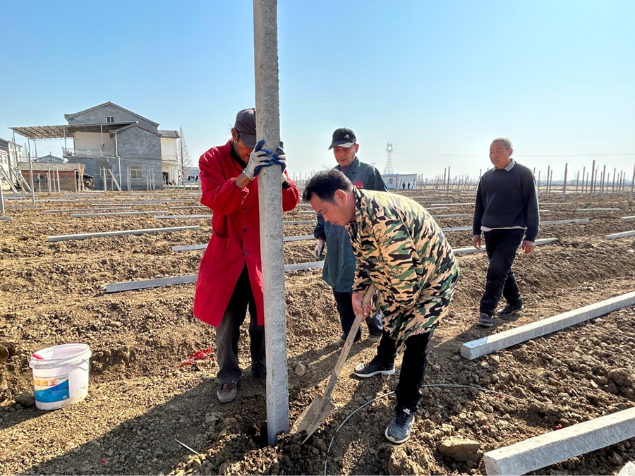 为保证今年葡萄的栽种和成活率,他抢抓春耕好时节一早就和村民在葡萄田里忙开了。做好春季葡萄田里的管理,对提高葡萄当年产量和品质尤为重要。“葡萄藤蔓的生长和果实的重量需要葡萄架子来支持,而这其中葡萄架的支柱就是关键。”正在忙碌的沈信万说,“不仅如此,各个支柱间的距离也有一定标准,这样确保栽种苗子时资源最大化利用。”只见大家相互配合,手里握着杆子、铁锹等工具来确定好葡萄架立柱点。