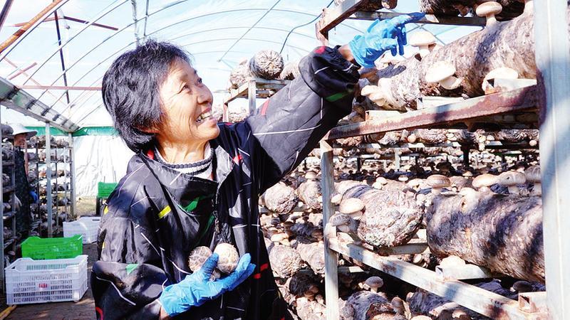 正在采摘成熟香菇的菇农黄霞脸上洋溢着丰收的愉悦。她说:“去年11月份开始,我就在这里采摘香菇,现在采摘第一茬秋栽香菇,在家门口就能打工赚钱,挺好的!”