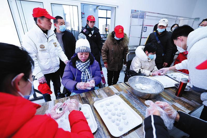 2月3日,曾都区民政局、残联、科协联合东城街道东兴社区居委会在世纪外滩小区举行2023年“玉兔元宵好味道幸福社区共缔造”主题活动,辖区群众共庆元宵佳节,共品中国传统文化。图为小区居民正在做汤圆、猜灯谜。(随州日报全媒记者 李文军摄)