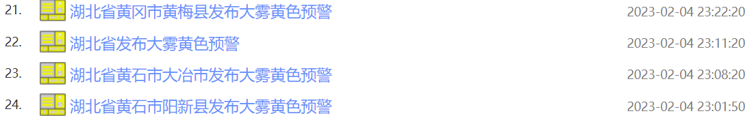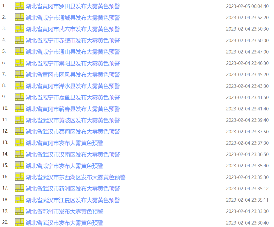 武汉中心气象台2023年02月04日23时06分发布大雾黄色预警信号:预计今晚(4日)到明天(5日)上午,武汉、黄冈南部、咸宁、黄石、鄂州将出现能见度小于800米,局部小于200米的雾,请注意防范。