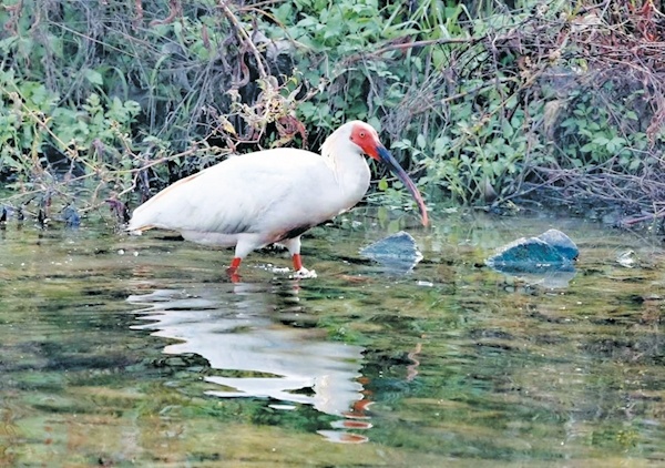 “根据这种鸟的习性,我推断它跑不远,肯定会顺着河道觅食。”6日上午,抵达犟河湿地公园后,他与朋友沿河分头徒步寻找,终于在上午11时许发现一只正在河道水草中觅食的朱鹮。