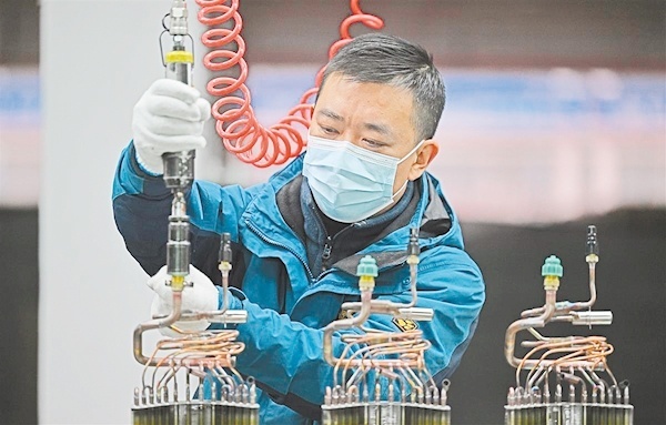 1月17日,荆州湖北美的楼宇科技有限公司新投产的生产车间内一派火热繁忙景象,员工们正在紧张有序地装配中央空调。(湖北日报全媒记者 刘曙松 通讯员 周栎 摄)