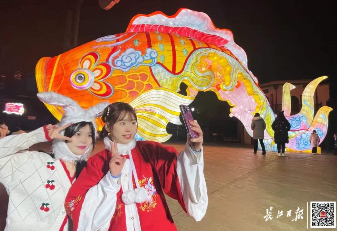 游客们结伴而行,在东湖迎春大鱼灯会度过兔年新春第一天。记者何晓刚 摄