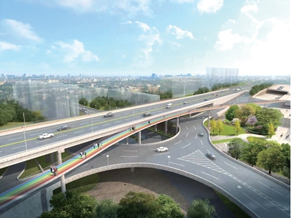 拟打造最“靓”天桥。综合考虑降噪、防滑、耐磨、视觉感、抗老化等因素,采用双层环保层抗滑。天桥颜色有5个方案:活力橙色方案,铺装采用活力橙单色布置;魅力红方案,铺装采用魅力红单色布置;简约灰方案,铺砖采用简约灰单色布置;五彩方案,包含红橙黄绿蓝五种颜色铺砖;三彩方案,包含红黄蓝三色。