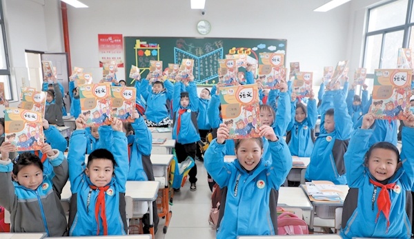 2月7日,张湾区阳光小学学生领到新课本后喜笑颜开。当日,全市各中小学校、幼儿园正式开学,普通高中及初中三年级已于1月30日开学。记者 潘世新摄