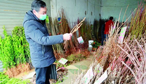 2月7日,荆门城区北门路几家苗木销售店生意兴隆,来自城区周边乡镇的一些农民忙着选购果树、风景树等苗木,为今年生产提早做准备。 (记者 郑波 摄)