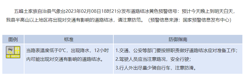 湖北省五峰土家族自治县发布道路结冰黄色预警