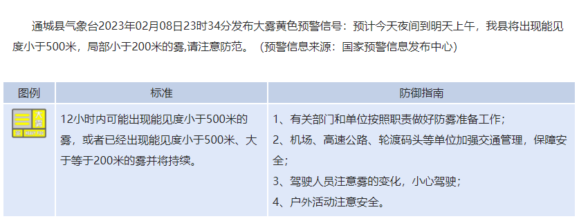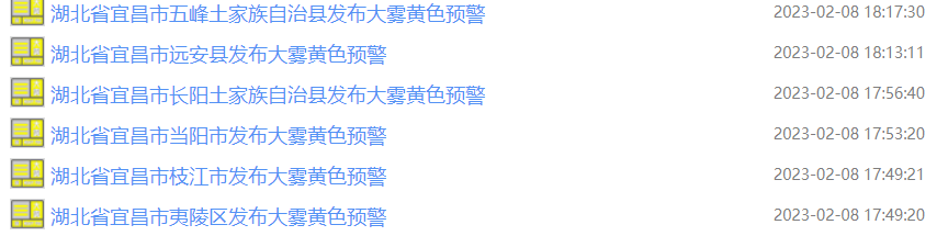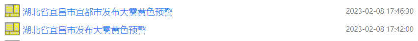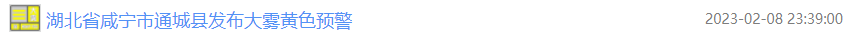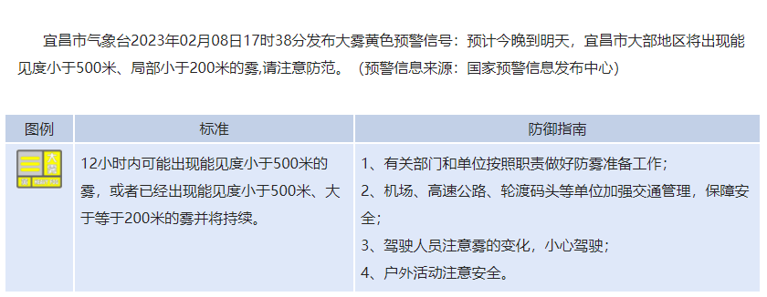 宜昌市气象台、咸宁通城县气象台发布大雾黄色预警信号:预计今天,部分将继续出现能见度小于500米、局部小于200米的雾,请注意防范。此外,恩施州气象台发布道路结冰黄色预警信号:预计今天,高山局部地区将出现对交通有影响的道路结冰,出行请注意安全。