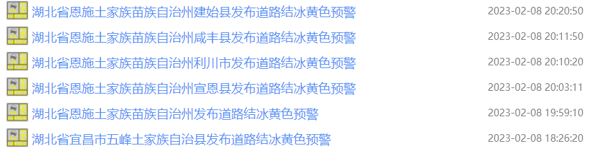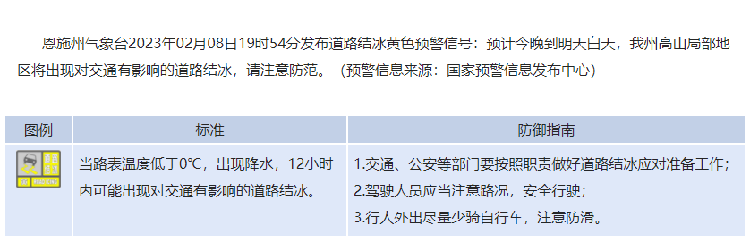 湖北省恩施土家族苗族自治州发布道路结冰黄色预警