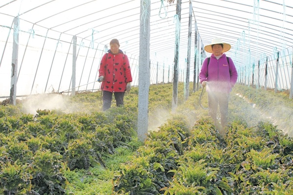 2月3日,房县化龙堰镇上湾村骏丰农业蔬菜基地里,当地农民在为莴笋喷施叶面肥。新年伊始,房县抢抓农时推进春耕春管,实施农作物田间施肥、锄草,培壮幼苗,掀起春耕备耕高潮。特约记者张启龙摄