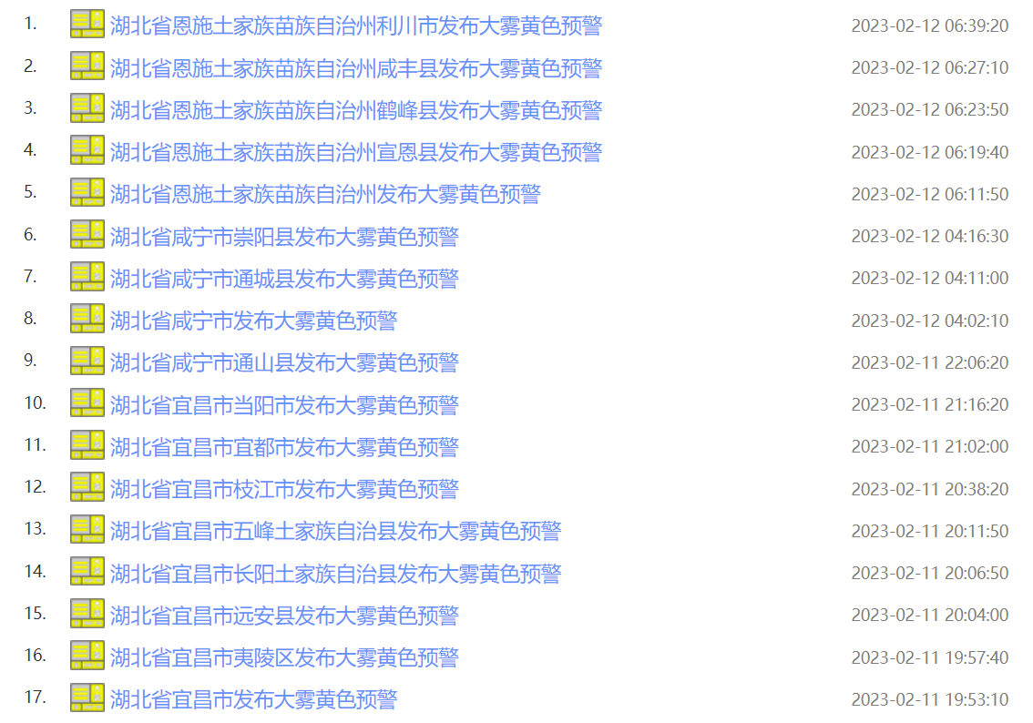 恩施州气象台2023年02月12日06时06分发布大雾黄色预警信号:目前,州内部分高海拔路段已出现能见度小于500米,局部小于200米的雾,预计今天上午仍将持续,请注意防范。