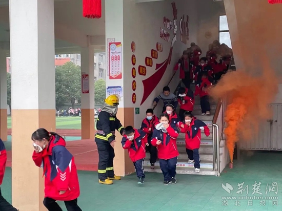 浓烟弥漫,警报响起,“险情”发生......学校立即启动消防应急疏散预案,全体学生在老师的带领下,按照既定的疏散路线,弯腰低头,捂住口鼻,迅速有序地撤离到操场安全区域。
