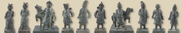 市博物馆一级青铜器保护修复项目由国家文物局2017年批复立项。该保护对象为市博物馆馆藏的一组明代组合铜俑,共计10件,包括男俑8件、女俑2件(如图),均为国家一级文物。该组合铜俑人物表情生动,姿态各异,有头戴高帽、曲臂、勒马、负重、戴镣、持物等造型。根据人物的形态及装束推断有军吏、解差、厮卒、军囚、女侍等。此次保护修复项目实施,主要针对文物病害,采取传统技术和现代科技相结合的方式,较好地完成了保护修复任务,达到预期目标。