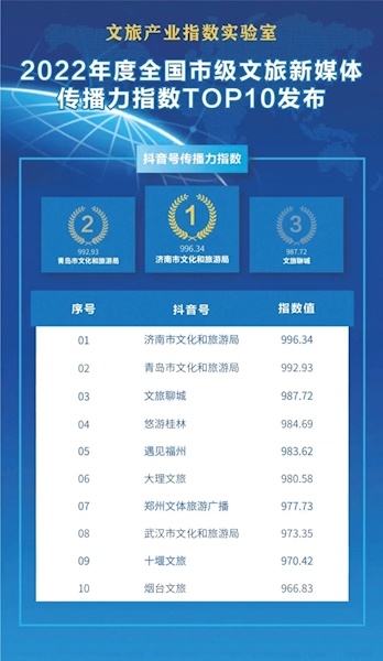 近日,文旅产业指数实验室发布了2022年度全国市级文旅新媒体传播力指数报告。其中,十堰文旅抖音号位列全国市级文旅行政部门官方抖音号传播力指数第9名。
