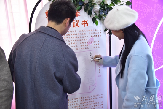 荆楚网(湖北日报网)讯(通讯员 杜巧云、石姣、陈俊)“我承诺:抵制高价彩礼,为爱减负,拒绝低俗婚闹,为爱守礼,主张婚事简办,为爱启航,传承优秀文化,为爱践行……”2月14日上午,大冶市婚姻登记处为当日上午登记领证的50对新人举行“为爱减负,我承诺、我践行”集体颁证活动,新人们在这个特殊的日子集体宣誓并在《婚俗改革倡议书》上签字承诺。