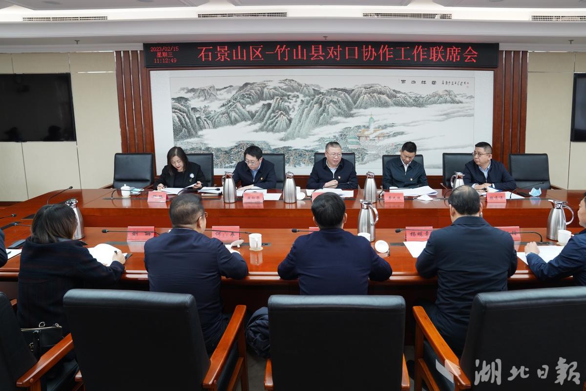 湖北日报客户端讯(通讯员 向继华)2月15日,竹山县委书记陈建平带队赴北京石景山区拜会石景山区委、区政府领导,参加石景山区和竹山县对口协作工作联席会。北京市石景山区委副书记、区长李新,区委常委、副区长李先侠等区领导热忱欢迎陈建平一行的来访。