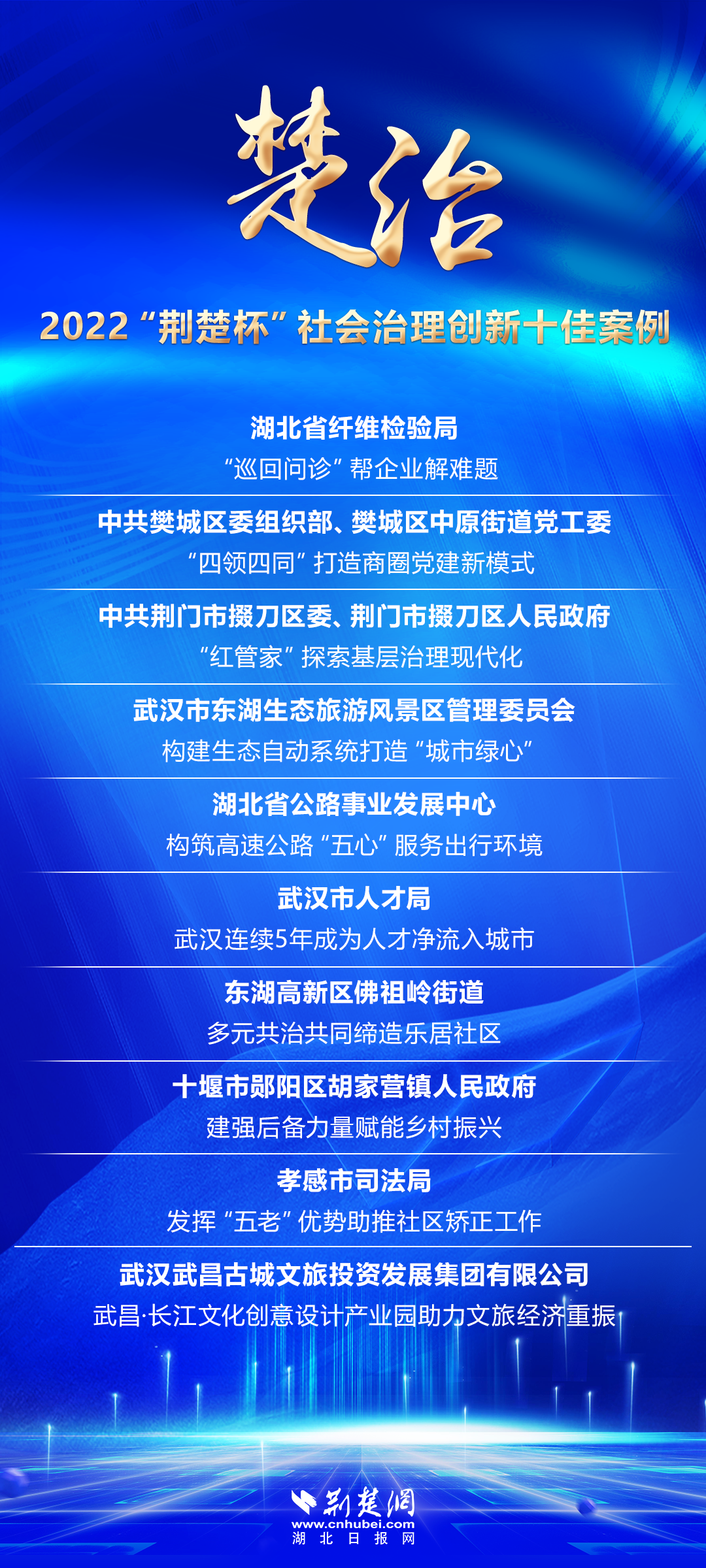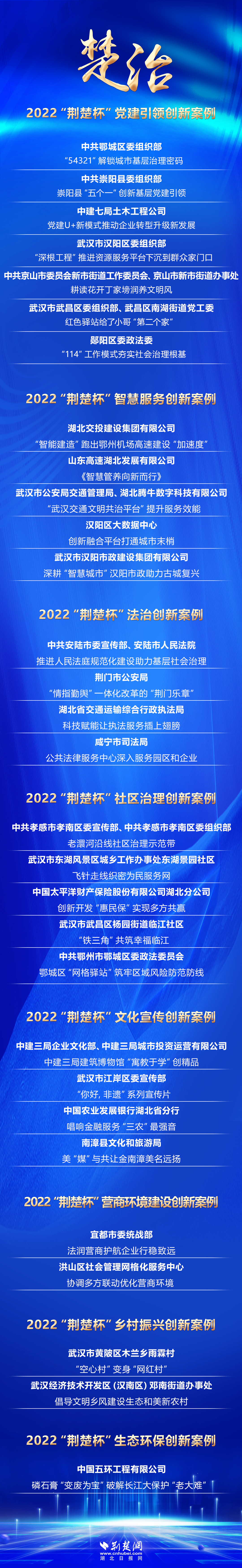 推介治理创新亮点,选树社会治理标杆。2022年10月,由湖北日报传媒集团主办,荆楚网(湖北日报网)、华中科技大学国家治理研究院、楚天舆情数据研究院联合承办的“楚治——2022‘荆楚杯’社会治理创新十大案例评选”活动,共有160余家单位报名参评。