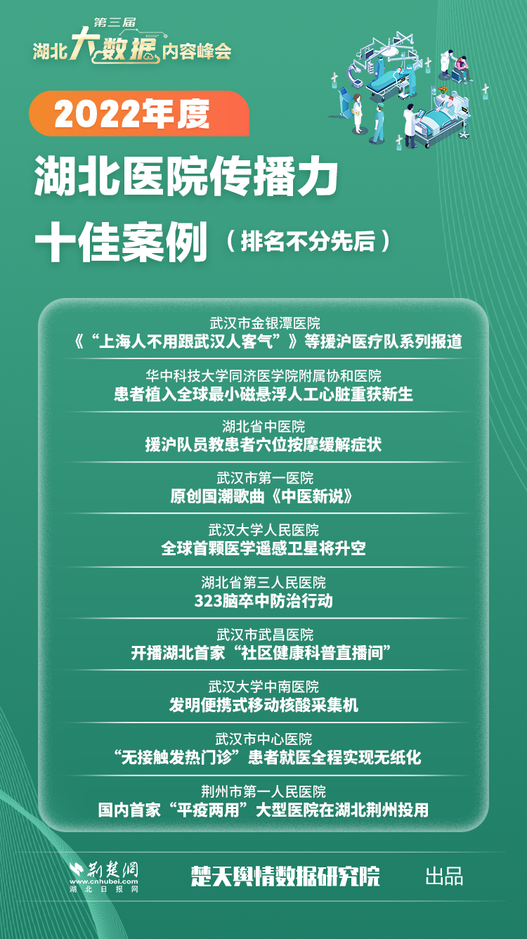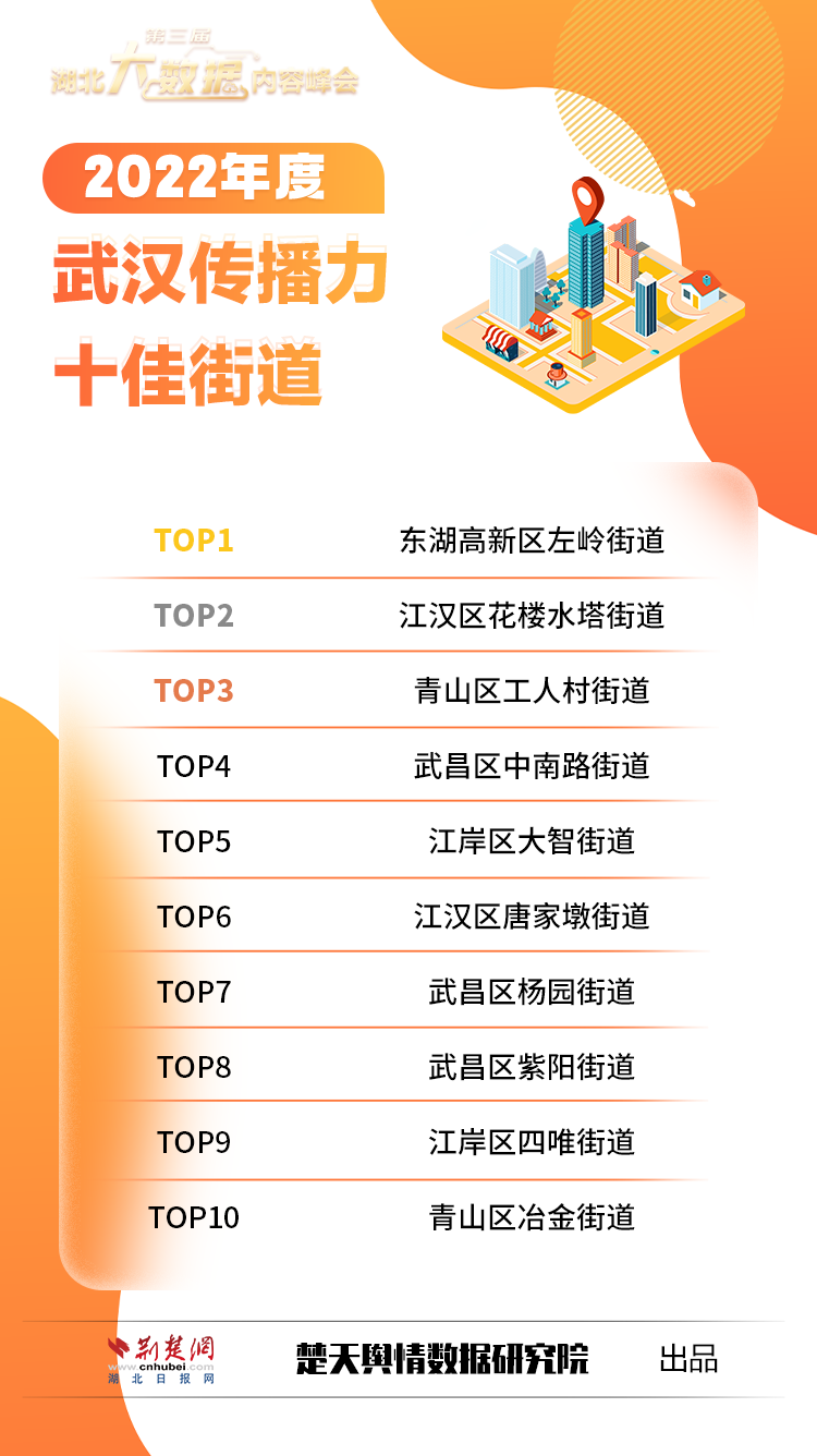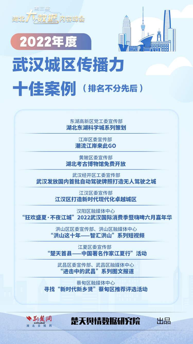 数据见证蝶变,榜单铭刻品牌。峰会发布了2022年度湖北城市传播力十佳区县、武汉城区传播力十佳案例、武汉传播力十佳街道、湖北医院传播力十佳案例并颁奖(获奖名单见下图)。