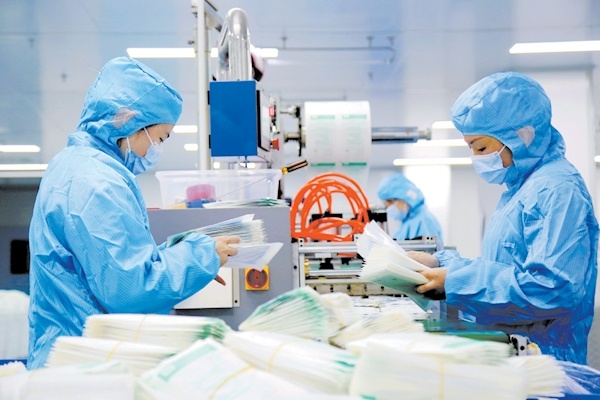 2月11日,在湖北康荣医疗防护用品(十堰郧阳)有限公司,工人在生产线上包装医护产品。新的一年,该公司加大设备投入,加强产品研发,坚持内销外销双向发力,外贸订单排到了6月份,第一季度预计产值可达2300万元。特约记者曹忠宏摄