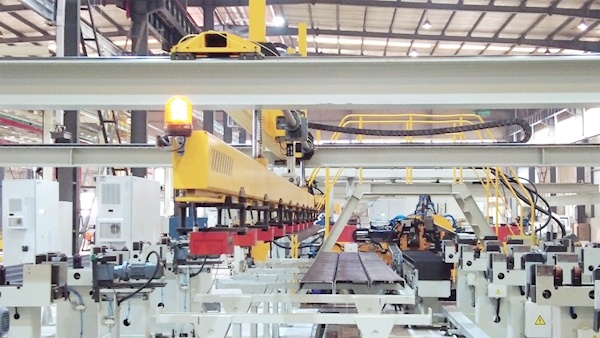 记者现场看到,工程师轻松地触机操作,设定好的加工数据在屏幕上闪动。在全自动化冲孔机旁边,吊臂轻盈地“衔”着一根5米长的大梁,稳稳地放置在操作台上。由全自动生产线一次性完成的三面冲孔、切割、折弯等加工程序一气呵成。转眼间,一根根大梁依次下线。
