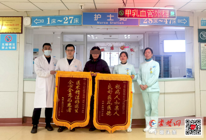 秦楚网-十堰头条讯 记者 吕鑫 特约记者 马婷婷 通讯员 王巍 报道:2月14日,来自襄阳的“甲癌”患者刘女士(化姓)将两面饱含着感激和赞叹的锦旗送到了十堰市人民医院甲乳血管外科一病区汪令成主任和医护人员手中。此前,她确诊甲状腺乳头状癌并已经向颈侧区淋巴结转移,是汪令成主任携团队使用腔镜淋巴结清扫技术为她治愈了癌症。