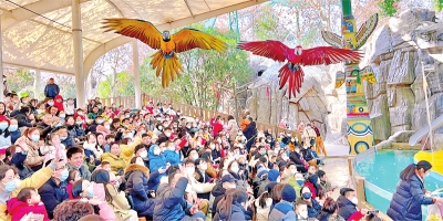 东湖海洋乐园中的东湖海洋世界、东湖飞鸟世界人流如织,小朋友在家长的带领下好奇地看着纹斑竹鲨、吸盘鱼,欣赏美人鱼和潜水表演;在东湖飞鸟世界与银灰色毛发的迷你羊、白色的羊驼、高高的长颈鹿亲切互动,看妙趣横生的动物行为展示,度过愉快的周末时光。