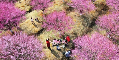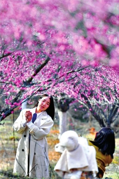2月19日,江夏梁子湖大道郊外的一处梅花林内,游客穿梭花海中。