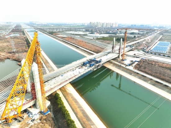 近日,在荆李路江汉运河交汇处,沿江一级公路跨江汉运河特大桥施工现场,东西两岸桥面相距已经非常接近,大桥合龙在即。