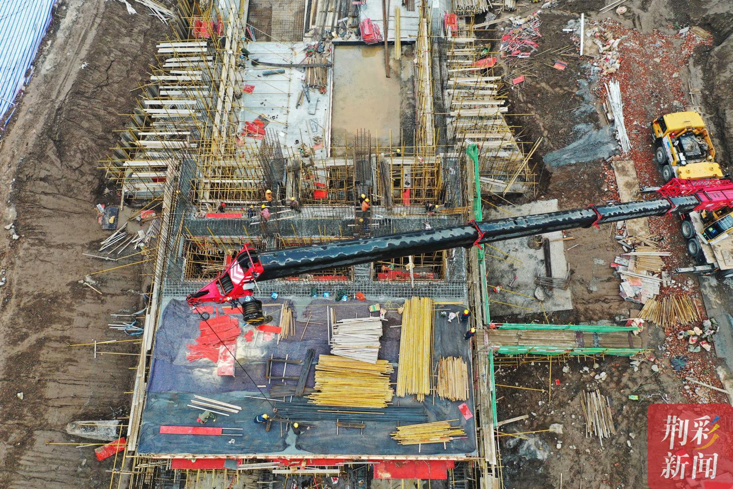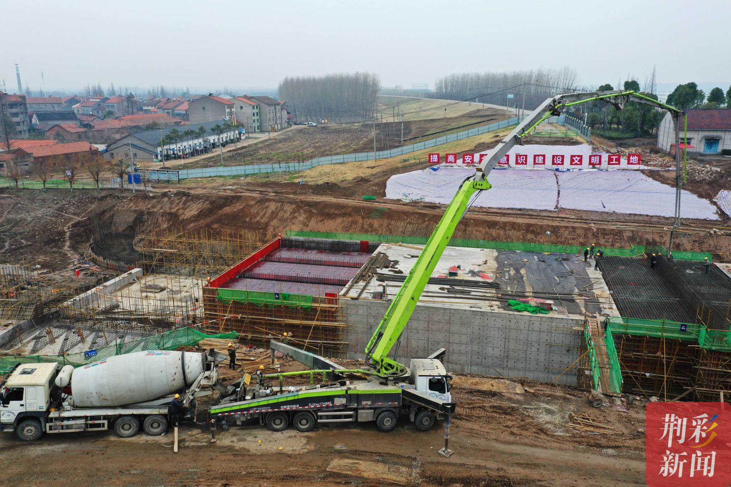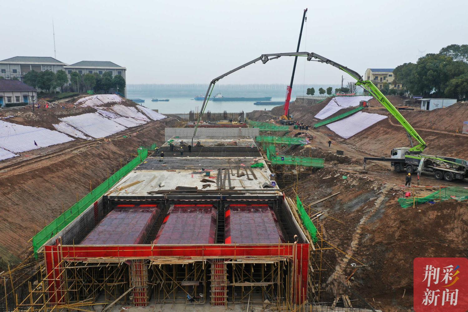 2月17日,位于江陵县境内的荆江大堤观音寺闸,两台大型水泥搅拌机及数十工人正在浇灌堤闸中的箱涵混凝土,施工已进入紧张阶段。
