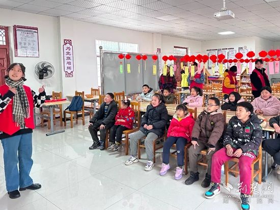 大二护理专业的丁佳慧在2021年就加入了学校的“星火支教”团队,寒假回到家乡麻城后,她组建“阅而有味读书会”。在春节期间,联合麻城市公益组织——青力缔造服务队,一起走进麻城市三河口镇碧枫冲村委会留守儿童之家,为30多个小朋友留守的儿童送去温暖礼包,陪他们做游戏,并为他们带去了别开生面的花灯制作课。