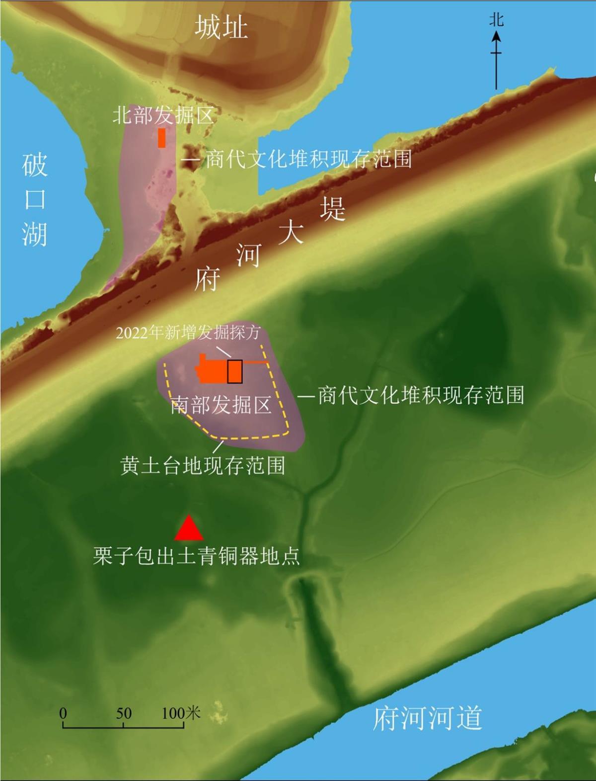 王家嘴地点鸟瞰及2022年发掘位置(上北)。