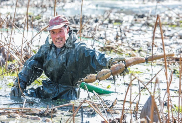 2月19日,竹溪县中峰镇樟扒沟农民专业合作社负责人刘仁和正使用高效不损藕的“水枪”挖藕。刘仁和流转250亩水田种植优质藕,带动3户农户年均增收4500元。通讯员温大树摄