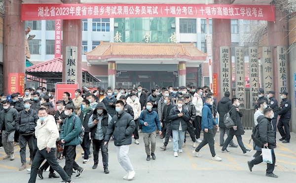 2月25日,为期两天的湖北省2023年度省市县乡考试录用公务员笔试结束,考生步出十堰分考区市高级技工学校考点。据了解,为方便考生应考,此次笔试全省各市州均设立笔试分考区,十堰分考区设置6个考点。市委组织部、市人社局等部门提前准备、周密部署,各相关单位和考点学校协同作战,确保了考场内外秩序井然有序。