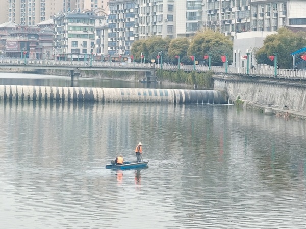 日前,竹溪河南大桥下的河面上,工作人员驾船打捞水面漂浮物。竹溪河被竹溪人民称为“母亲河”。围绕创建全国文明城市,该县对竹溪河开展环境卫生专项治理行动,动员城乡居民共同守护一河清水。特约记者付延峰摄